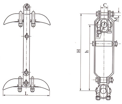 线夹本体和压板为可锻铁件,闭口销为不锈钢制件,其余为钢制件、可锻铸铁件和钢制件热镀锌。