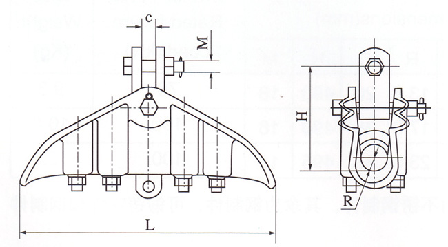 线夹本体和压板为可锻铸铁件,闭口销为不锈钢制件,其余为钢制件、可锻铸铁件和钢制件热镀锌