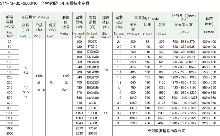 2、 有关更大容量的10kV级配电变压器的技术参数,外形尺寸及重量数据请垂询我公司。