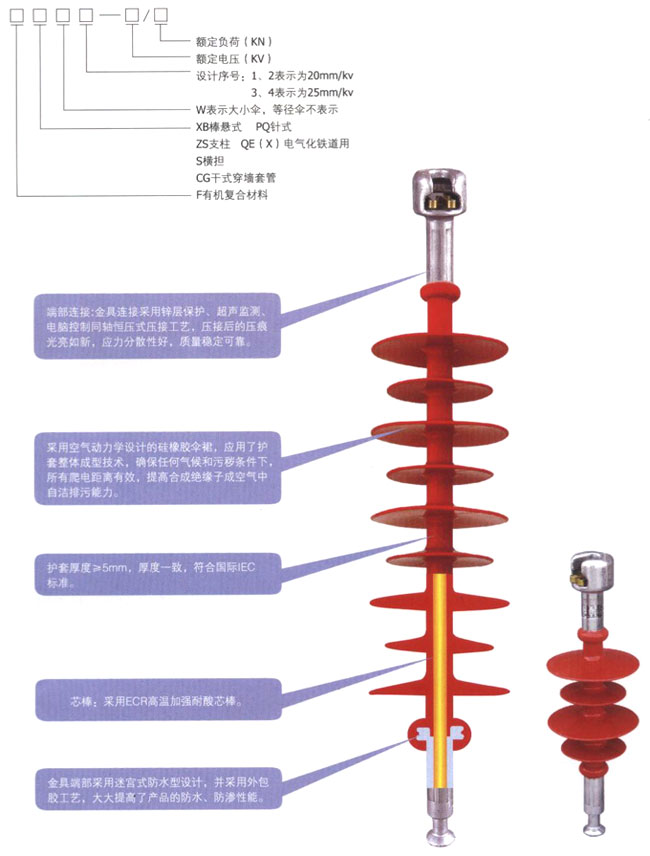 本公司生产的复合绝缘子是在高温搞难度压下整体一次成型工艺,金具与芯棒的联接采用国际上先进的压接工艺,并配有全自动声发射探伤监测系统,金具端头采用迷宫式设计原理,多层保护,密封性能好,解决了绝缘子最关键的问题——界面电气击穿。本公司拥有先进的生产设备和齐全的检测设备及检测手段,制造工艺先进,各项技术指标均符合相关国内及国际标准,是高电压输变电线路的新一代绝缘子。